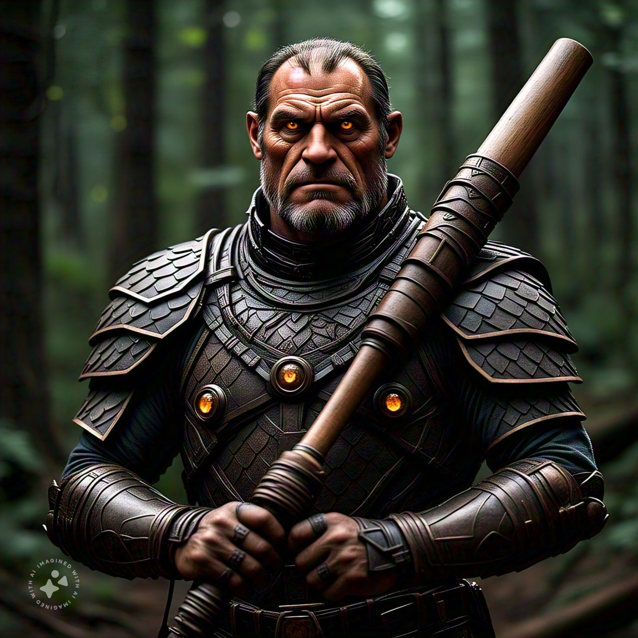 Meio-orc carrancudo, barba e cabelo cinza com início de calvície, olhos amarelos intensos. Anda com um pequeno dragão companheiro (Fido) do tamanho de metade do seu corpo.