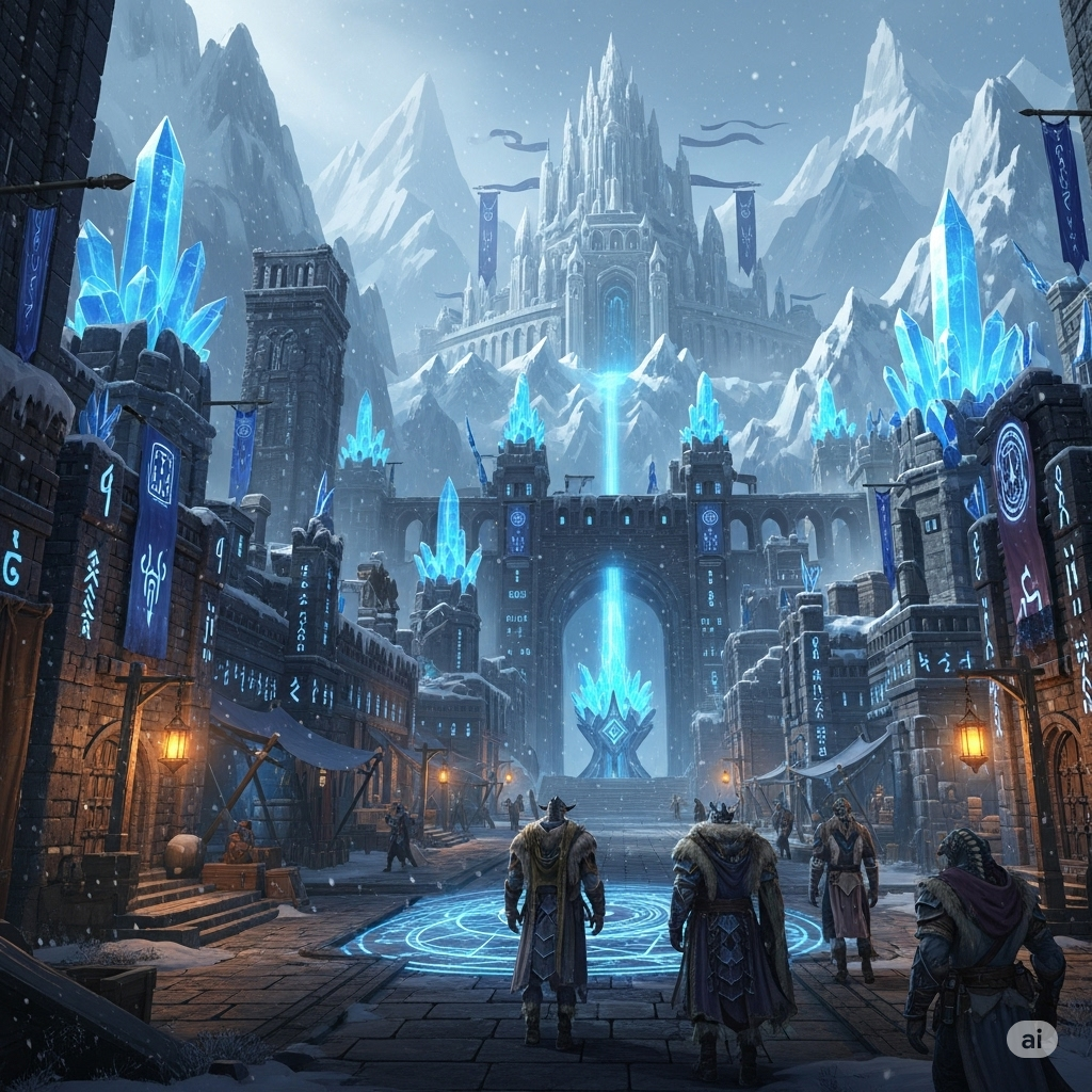 Casas de pedra negra e cristal de gelo reforçadas com runas. No centro, um poço de luz ley sustenta orações e experimentos. Ruas aquecidas por selos térmicos no chão fazem o vento cantar entre torres, inspirando o epíteto da cidade.