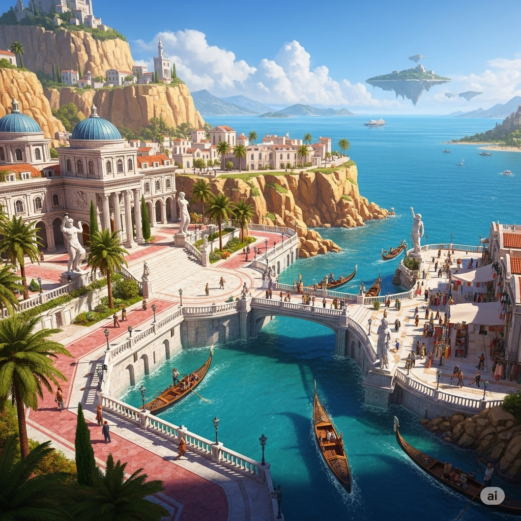 - Gôndolas Celestiais: Pequenos barcos encantados, esculpidos em madeira brilhante e impulsionados por elementais da água quase invisíveis, que transportam os turistas pelos canais que serpenteiam por partes da cidade baixa. Um passeio romântico e caro, perfeito para observar a cidade de um ângulo único.